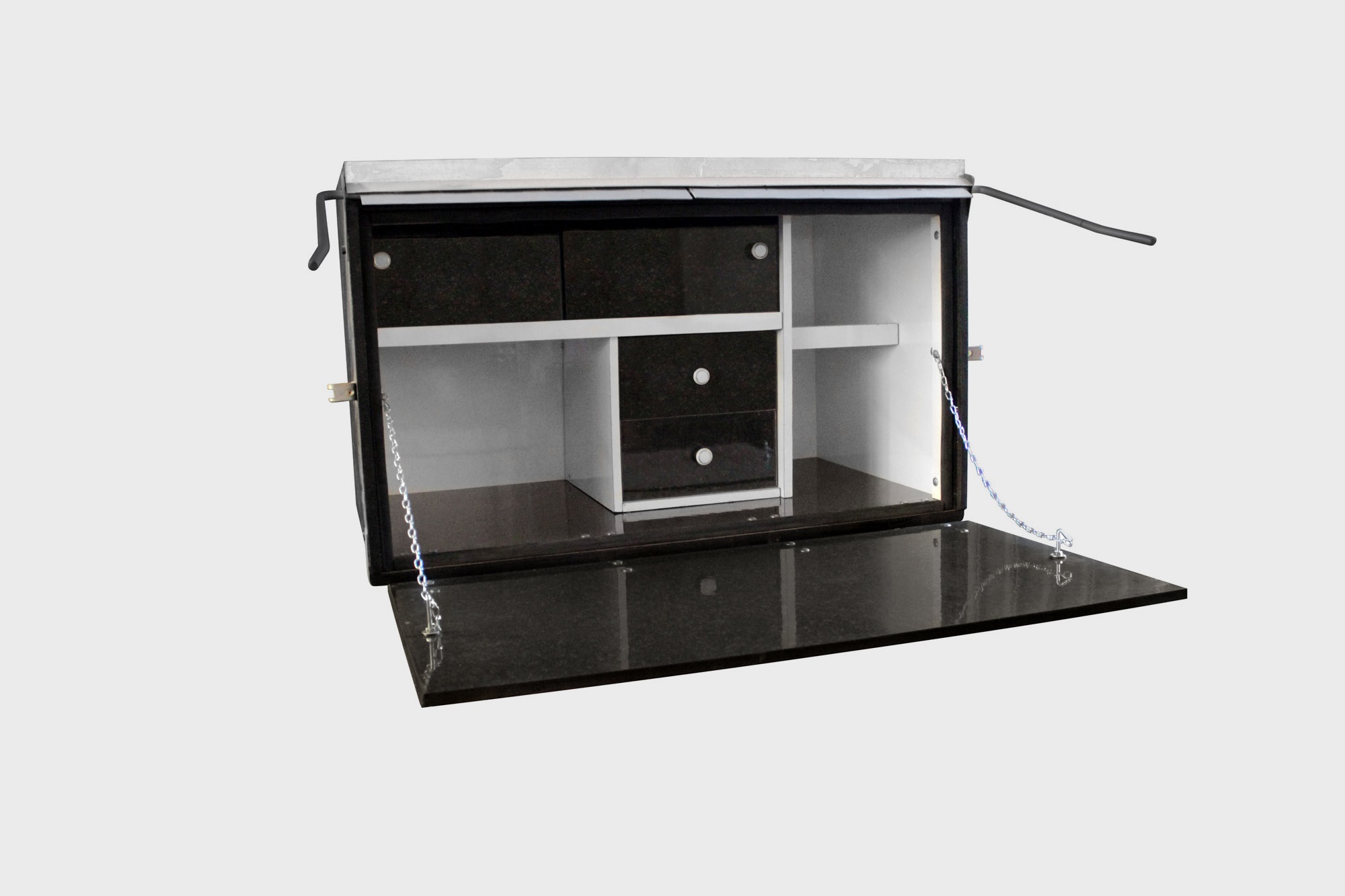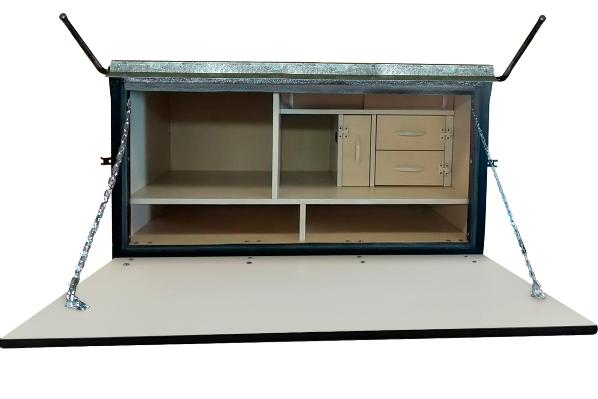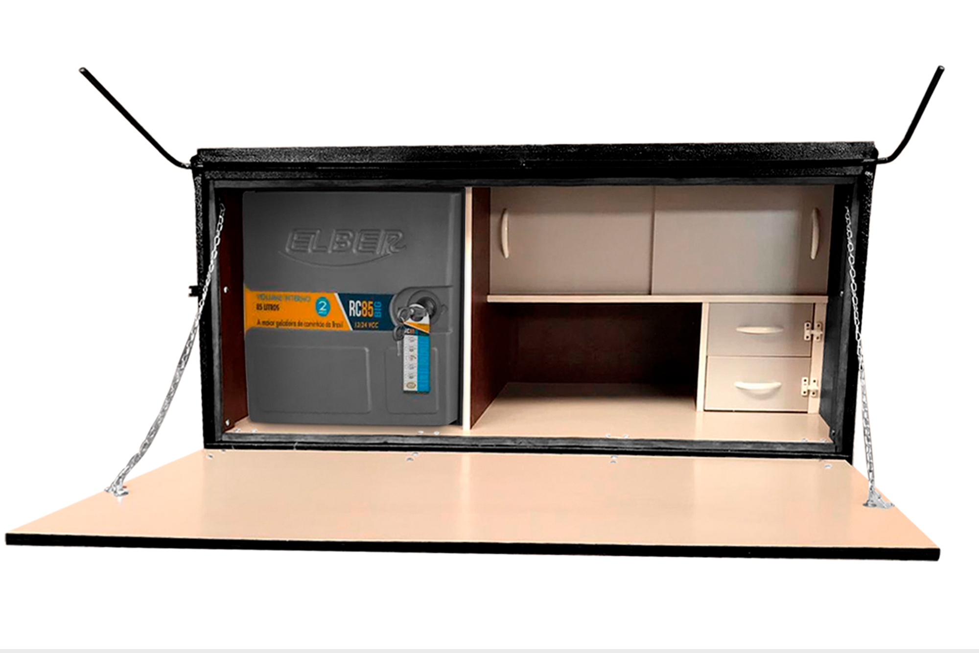 As caixas de cozinha CAPUTO são confeccionadas em compensado naval, dobradiças reforçadas, revestimento interno em fórmica, vedação total da porta com borracha, fecho rápido com trava e porta cadeado, calha protetora e trava nas gavetas, acabamento externo com emborrachamento e esmalte sintético.