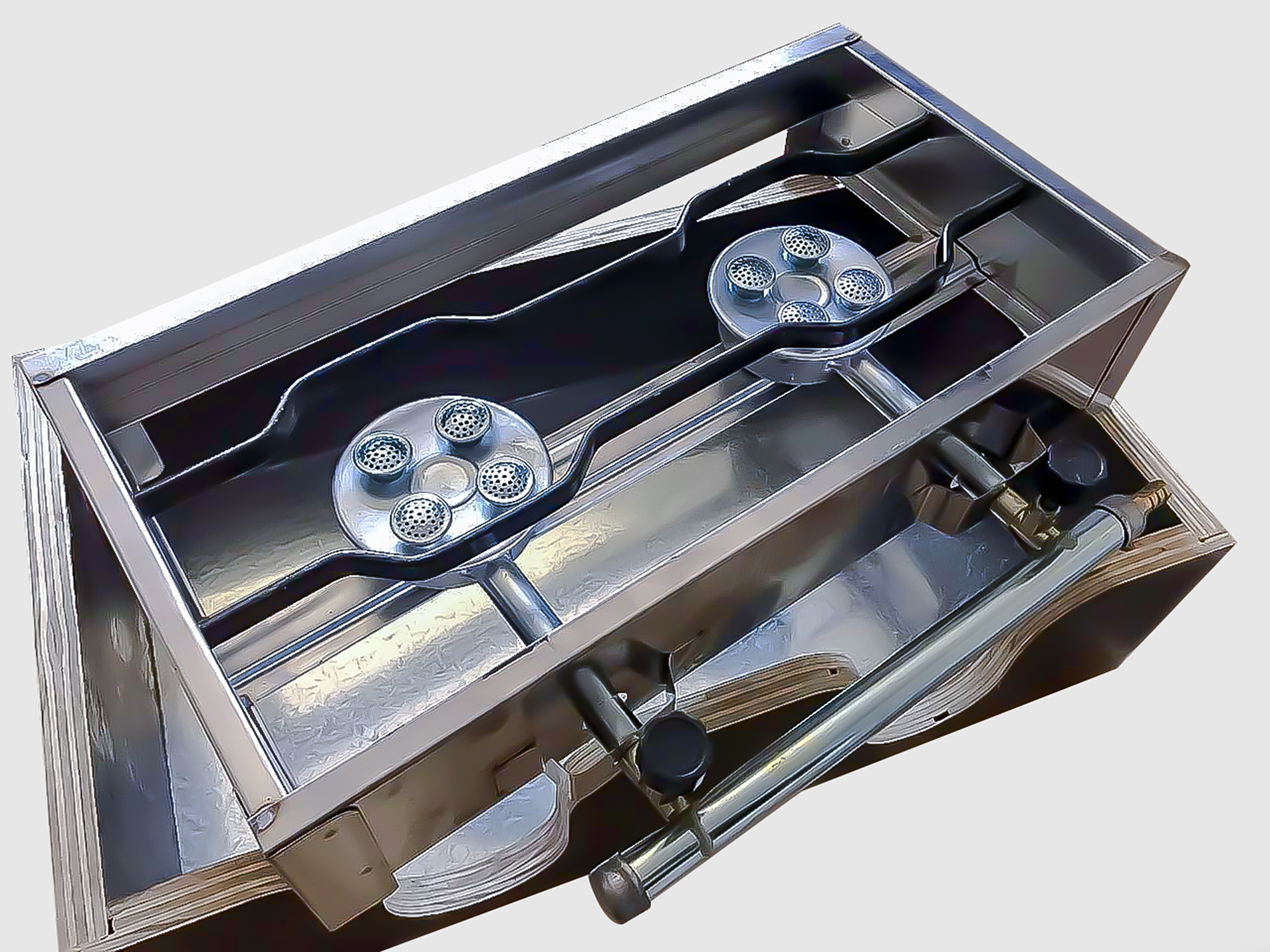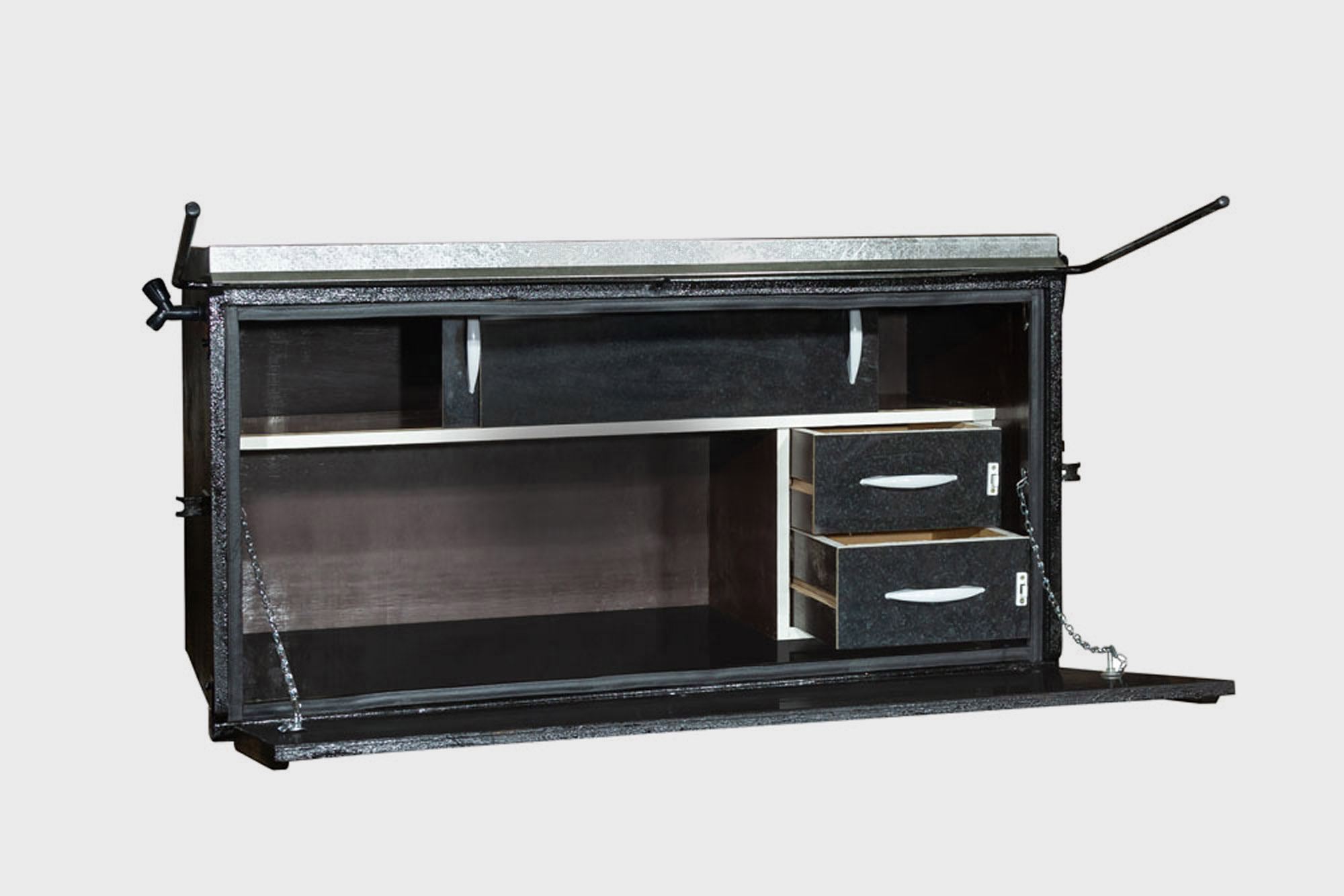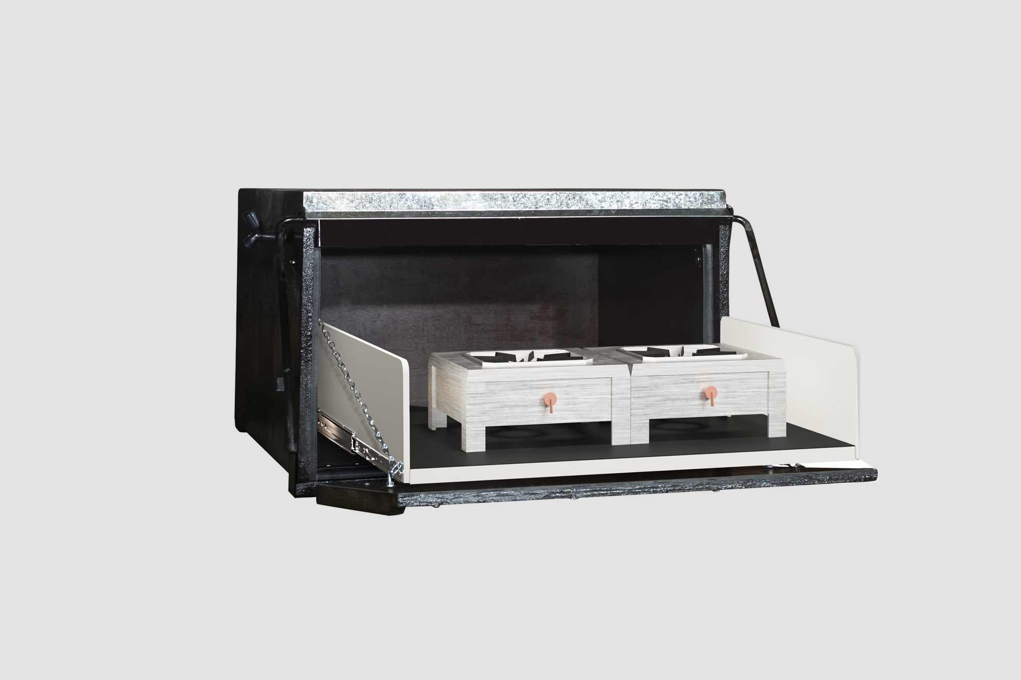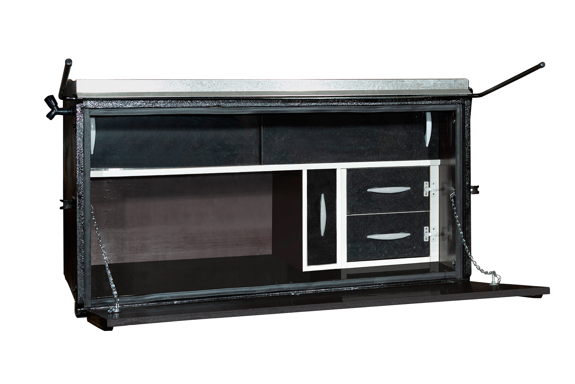 As caixas de cozinha CAPUTO são confeccionadas em compensado naval, dobradiças reforçadas, revestimento interno em fórmica, vedação total da porta com borracha, fecho rápido com trava e porta cadeado, calha protetora e trava nas gavetas, acabamento externo com emborrachamento e esmalte sintético.